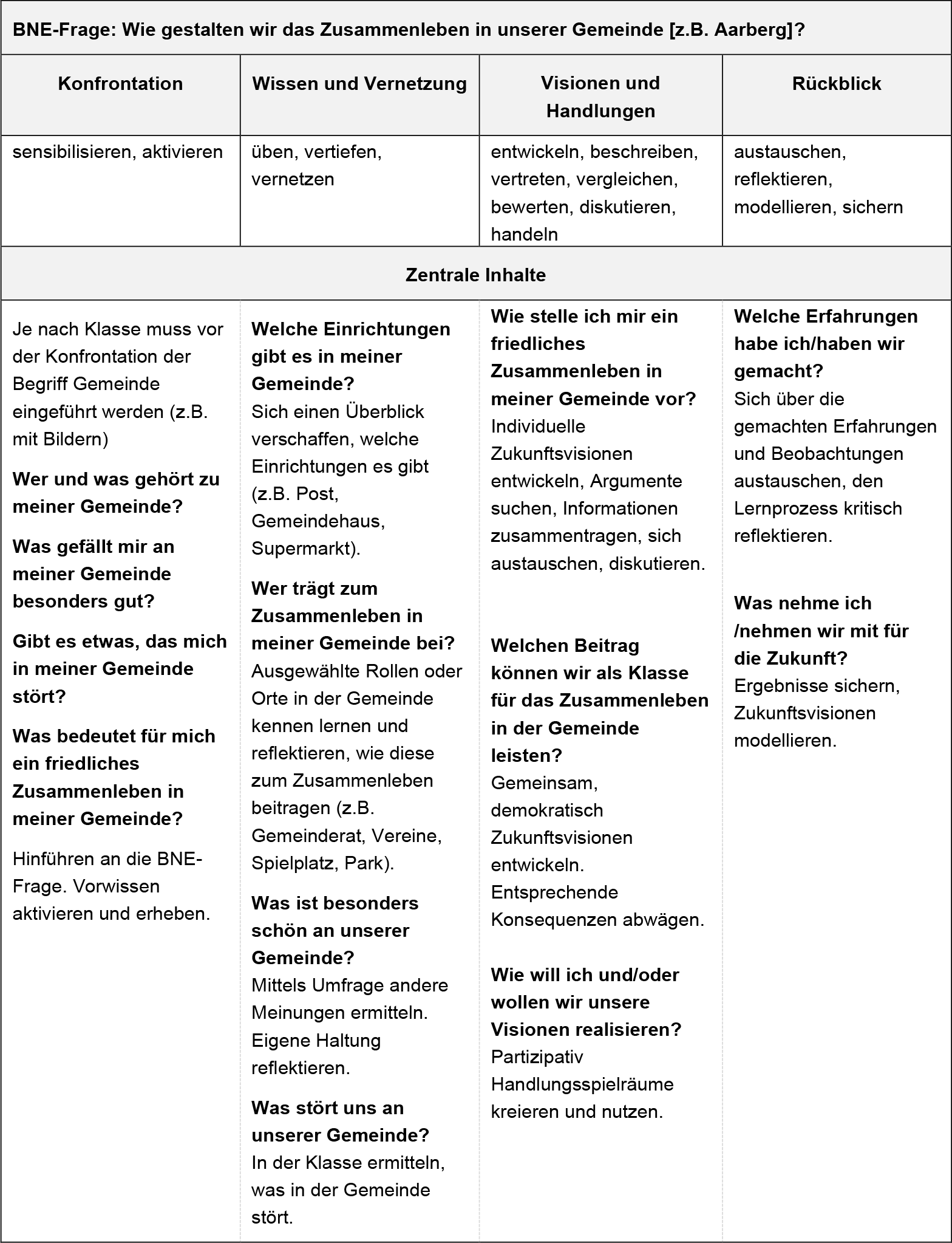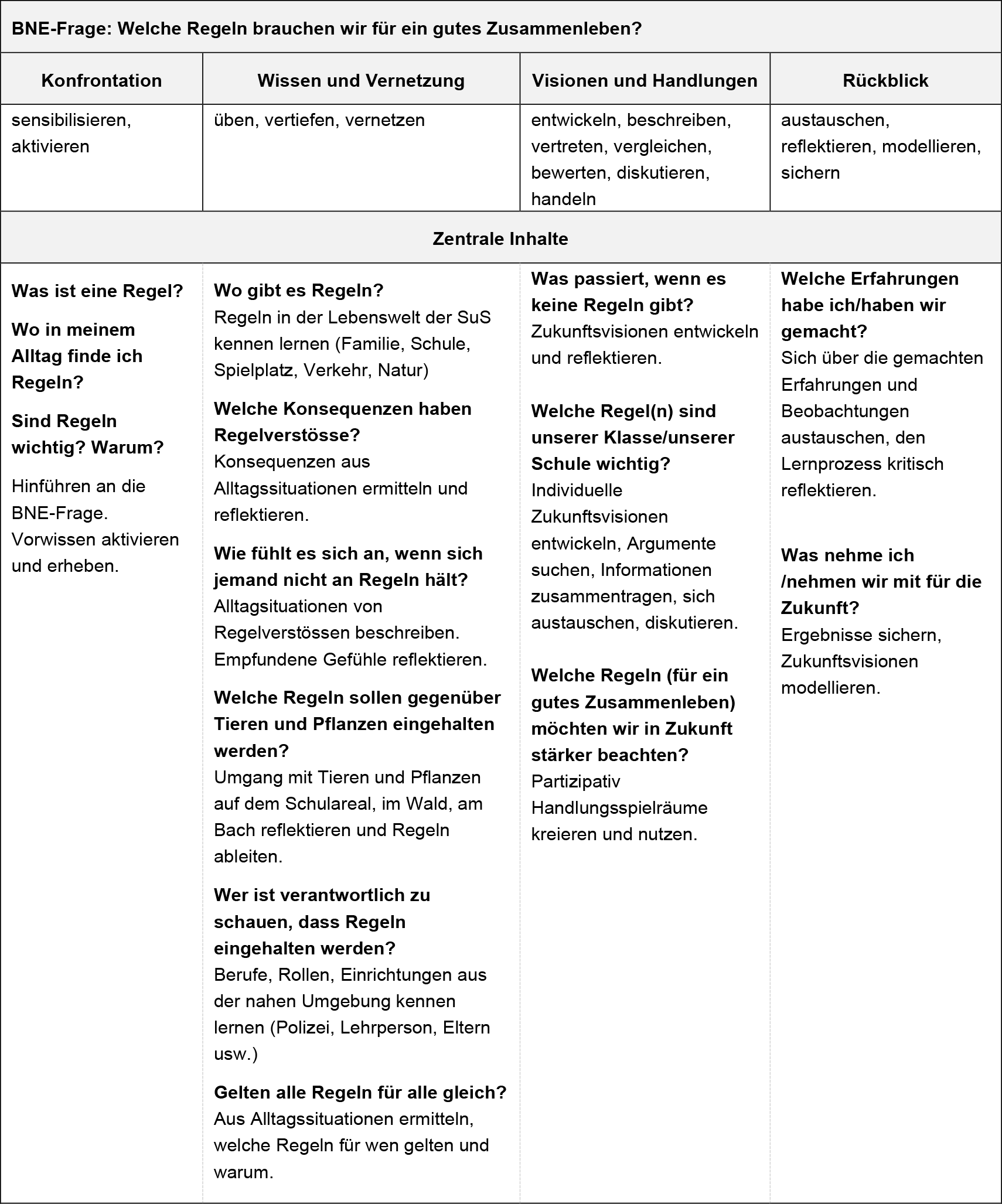 Da das Zusammenleben auch auf die Probe gestellt werden kann, lernen Schülerinnen und Schüler in Konfliktsituationen nach konstruktiven Lösungswegen zu suchen. Dabei lernen sie eigene Anliegen einzubringen, andere wahrzunehmen und auf sie einzugehen (NMG 1.1; NMG 10.1). Ausserdem ist das Zusammenleben oft durch Machtverhältnisse und Rechte geprägt, solche gilt es in konkreten Alltagssituationen zu reflektieren (NMG 10.4). Zusammenleben bedeutet demnach auch über Normen und Werte nachzudenken – etwa darüber, was wertvoll (materielle und immaterielle Werte) (NMG 11.3) oder was gerecht ist (NMG 11.4). Schliesslich bedeutet es das Zusammenleben auch unter Einbezug der Natur zu gestalten. Dazu ist die eigene Beziehung zur Natur zu erkennen und zu reflektieren, indem zum Beispiel über Pflege, Wertschätzung oder Respekt gesprochen wird (NMG 2.6).Umsetzung von BNE-Fragen im Unterricht