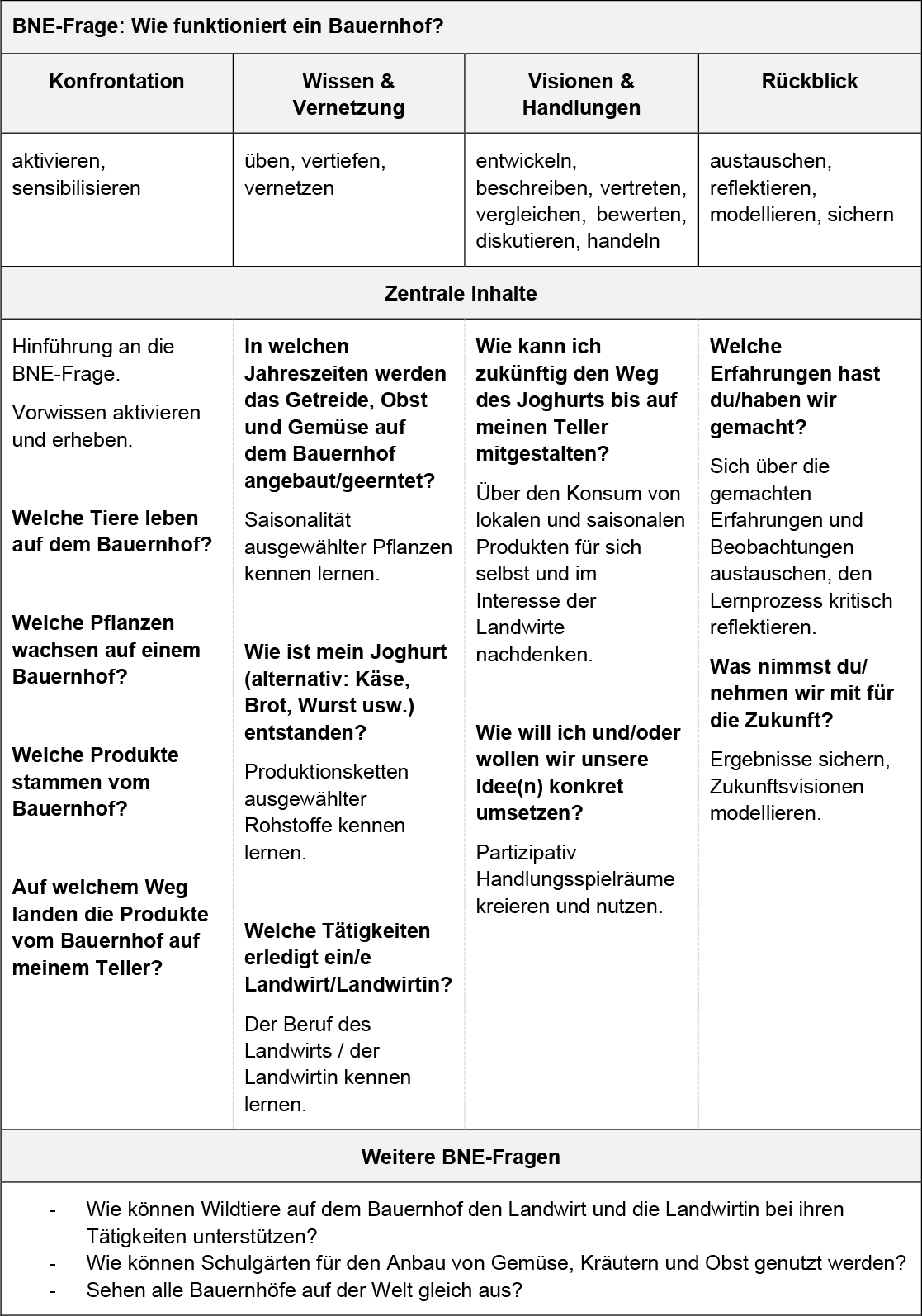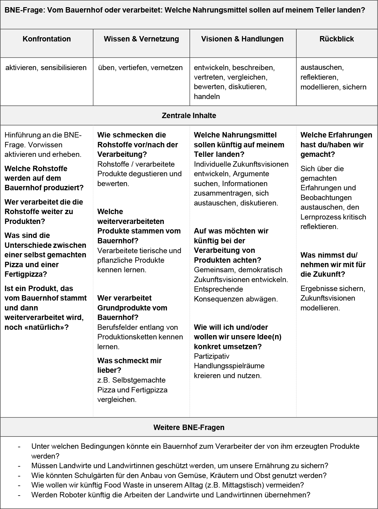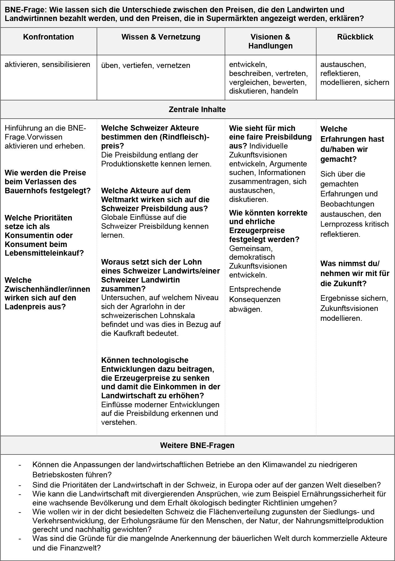 BNE-Fragen geben Lehrpersonen eine inhaltliche Orientierungshilfe, um den Fokus im komplexen, gesellschaftsrelevanten Thema zu behalten, und ermöglichen Schülerinnen und Schülern, sich mit Fragen der Nachhaltigen Entwicklung im Kontext «Landwirtschaft» auseinander zu setzen.