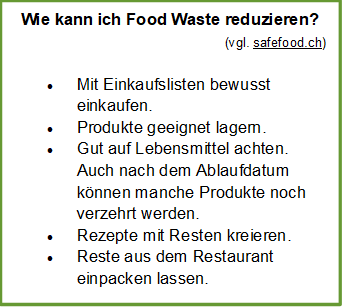 Die derzeitigen Produktionsmuster gefährden die Gesundheit der Menschen und die des Planeten und führen zu einem Ausmass an Umweltverschmutzung und Verschwendung. Ein Drittel der weltweit produzierten Lebensmittel geht verloren oder wird verschwendet. Die Bekämpfung des Food Waste ist von entscheidender Bedeutung, um die Lebensmittel- und Ernährungssicherheit zu verbessern, aber auch um die Klimaziele zu erreichen und die Umweltbelastungen zu verringern. Lebensmittelverschwendung tritt in vielen Formen auf: weggeworfenes unvollkommenes Obst und Gemüse; Überproduktion; Transport- und Lagerungsverluste; zu grosse Portionen, die gekocht und serviert werden; Lebensmittel, die in den Müll geworfen werden (nicht rechtzeitig gegessen, schlecht gelagert, in zu grossen Mengen gekauft).