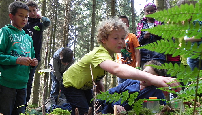 Als Walddetektive lernen die Kinder Tiere und Pflanzen der verschiedenen Stockwerke kennen und begreifen spielerisch die Beziehungen zwischen den Lebewesen im Ökosystem Wald. - 2. Zyklus