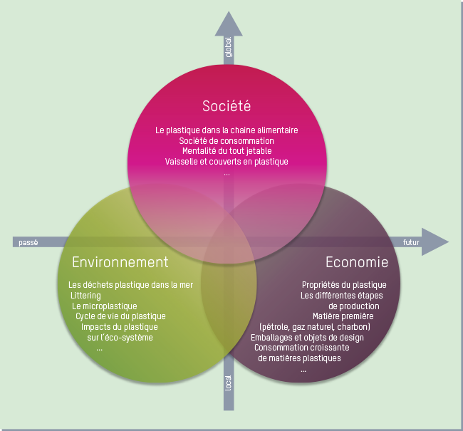 La dualité entre un cycle d’utilisation très court (81% devient un déchet en moins d’un an) et la durée de vie presque infinie du plastique soulève de nombreuses questions essentielles en lien avec l'EDD, mobilisant les niveaux individuel et collectif, économique, politique et environnemental.