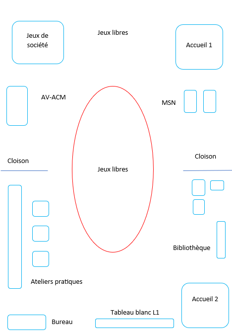 Un coin d’accueil pour chacune des classes aux extrémités ; d’autres petits espaces prévus pour divers ateliers et les jeux libres ; une zone délimitée par une ligne rouge pour les activités réunissant tous les élèves. - Outils de communication et de planification pour co-enseignement