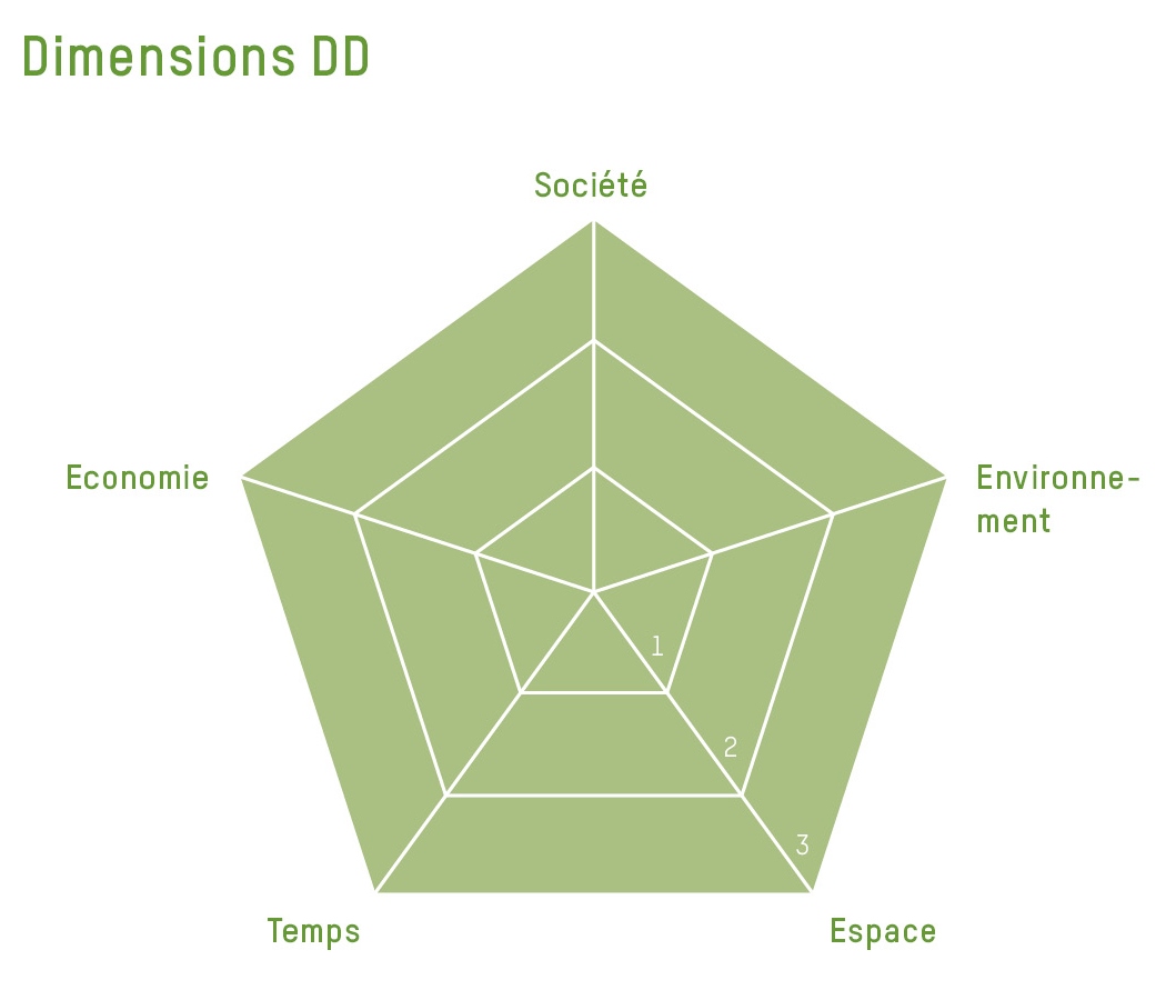 Le développement durable s'explique souvent par les trois dimensions que sont l'environnement, l'économie et la société (cf. Office fédéral du développement territorial). Ces dimensions doivent être complétées par la dimension temporelle et la dimension Nord-Sud :