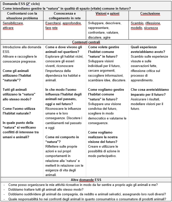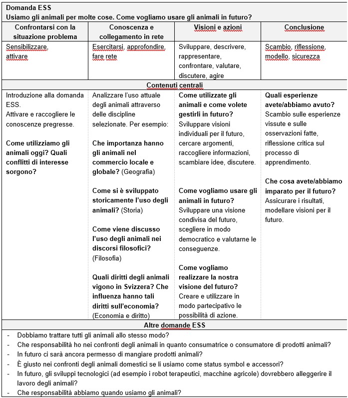La domanda ESS fornisce al corpo docenti delle indicazioni sui possibili contenuti per mantenere al centro dell'attenzione la complessità dell'argomento e la sua rilevanza sociale, consentendo alle allieve e agli allievi di affrontare le questioni dello sviluppo sostenibile nel contesto "uomo-animale".