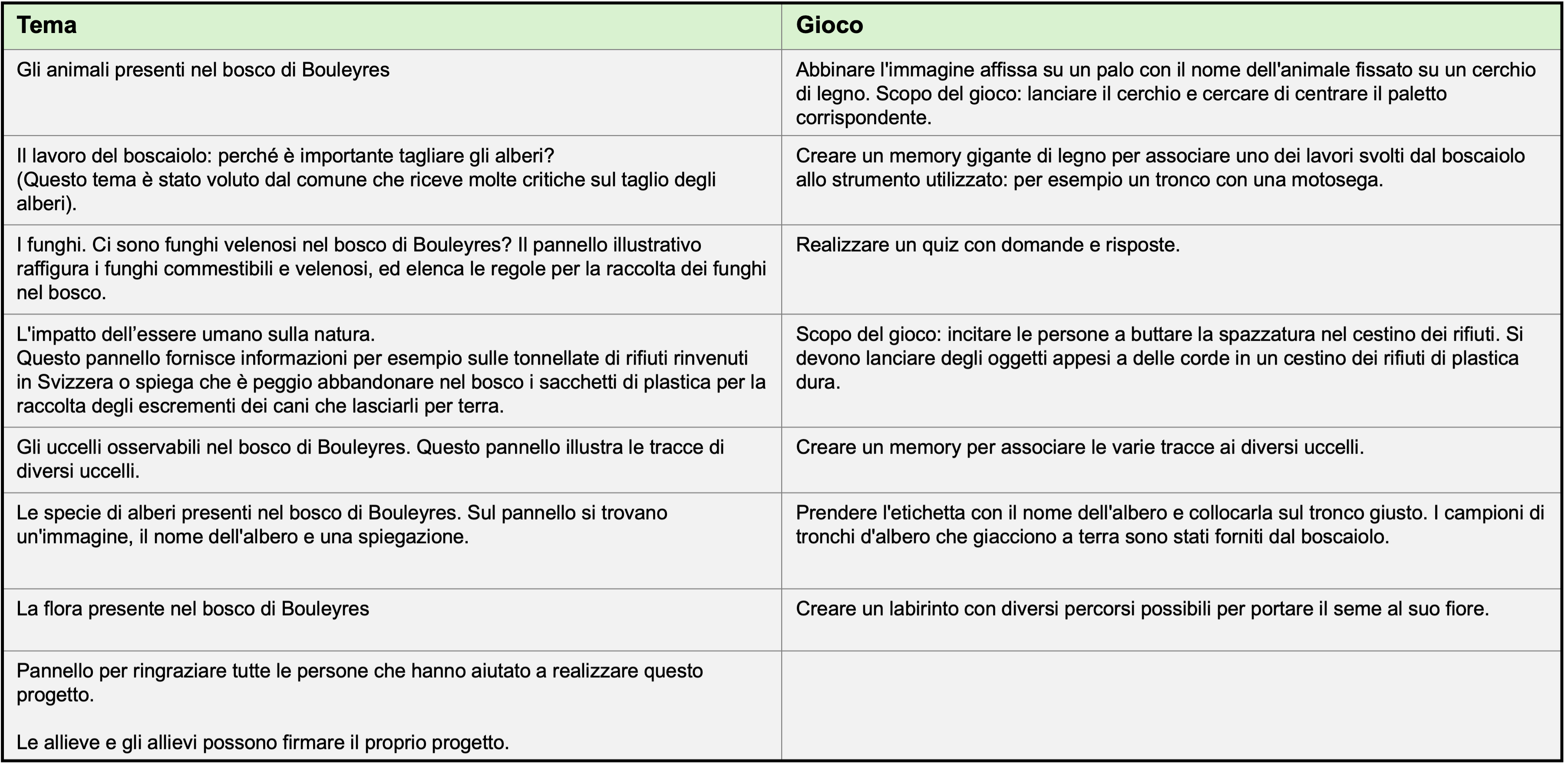 In base alla loro esperienza personale e al fatto che essi stessi non leggono i cartelli che incontrano per strada, le allieve e gli allievi realizzano che i testi sui pannelli dovrebbero essere abbinati a dei giochi. La classe discute sui giochi da scegliere: giochi "fisici" oppure giochi che richiedono dapprima la scansione di un codice QR che dà accesso a una pagina web e poi al gioco stesso. Dato che considerano di stare sempre davanti allo schermo, le allieve e gli allievi optano per dei giochi "fisici". Tra le molte idee di gioco raccolte è necessario operare delle scelte. L'insegnante deve quindi ridefinire il quadro di riferimento e optare per dei giochi fattibili.Temi dei pannelli e giochi ad essi abbinati