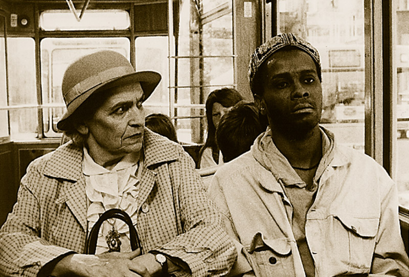 Durante un tragitto in tram, un giovane di colore viene pesantemente insultato da una signora anziana. I passeggeri attorno a loro sono testimoni della scena sgradevole. Non intervengono. La gente fa cenni di approvazione, guarda imbarazzata o fa finta di niente. Gli insulti diventano più pesanti, la tensione tra i viaggiatori cresce. La situazione si protrae per due, tre stazioni finchè sale il controllore e chiede i biglietti.