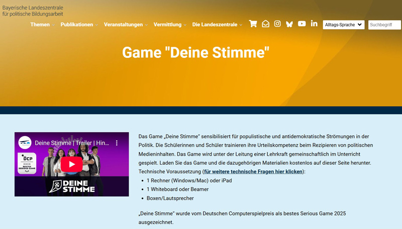 Die Online-Simulation «Deine Stimme» unterstützt diesen Prozess, indem Schülerinnen und Schüler einen demokratischen Wahlablauf miterleben und mitgestalten. Dabei schärfen sie nicht nur ihre Urteilskompetenz im Umgang mit medialen Inhalten, sondern lernen politische Aussagen und populistische Einflüsse kritisch zu hinterfragen. Zudem erkennen sie politische Zusammenhänge und verstehen deren langfristige Konsequenzen.