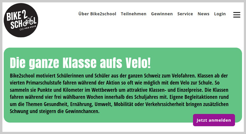 Bike2School will Kinder und Jugendliche (10 bis 20 Jahre) für das Velofahren auf dem Weg zur Schule motivieren. Jede/-r Teilnehmer/-in sammelt Punkte und Kilometer, wenn er/sie das Velo für den Schulweg verwendet. Begleitaktionen zu den Themen Umwelt, Mobilität, Sicherheit, Gesundheit und Ernährung verstärken die Wirkung der Aktion. Durchgeführte Begleitaktionen im Klassenverband geben zusätzlich Punkte.Chancengleichheit und Gesundheit (Broschüre)
