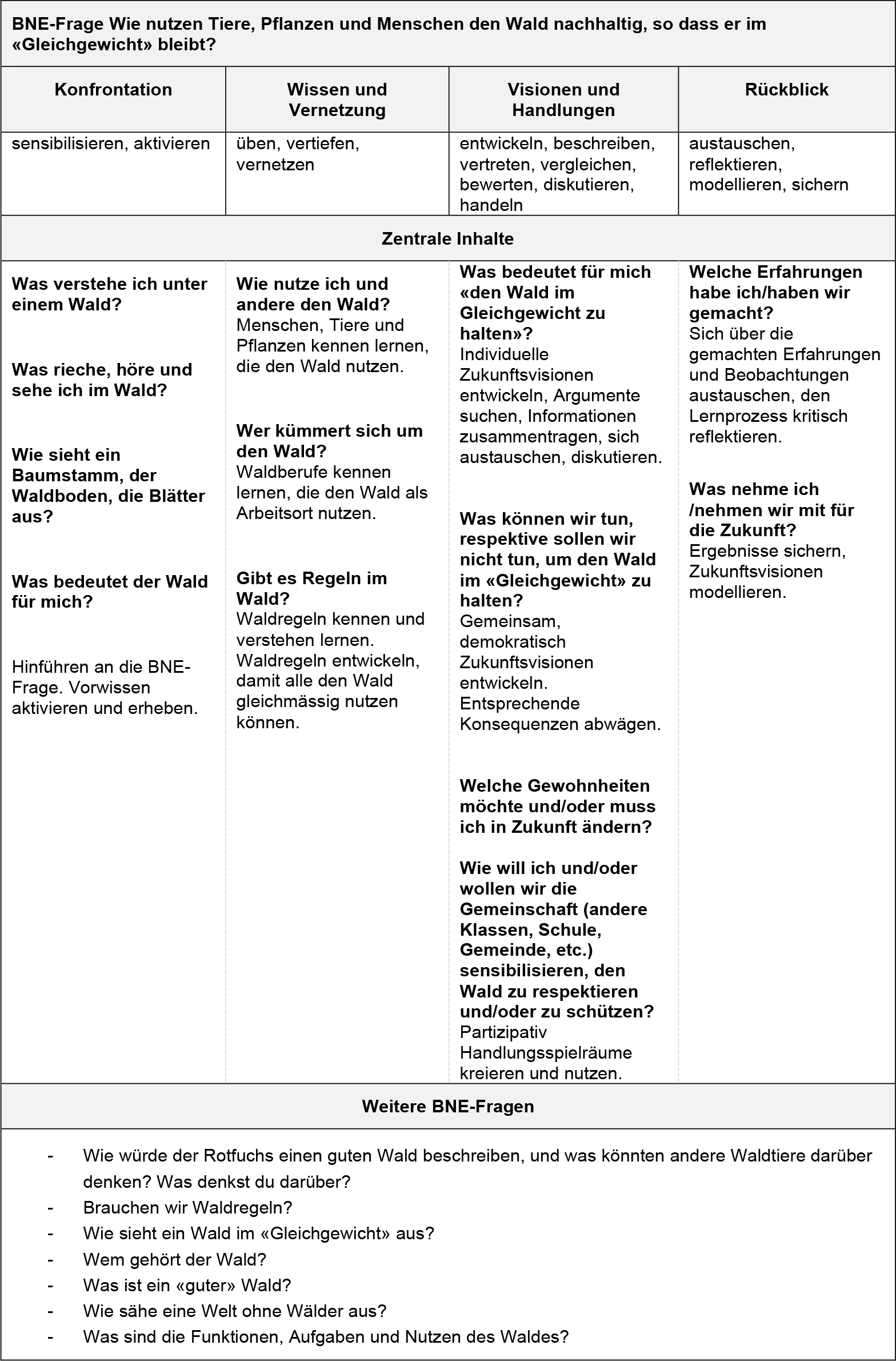 «Wie nutzen Tiere, Pflanzen und Menschen den Wald nachhaltig?». Mit dieser BNE-Frage werden die Schülerinnen und Schüler auf spielerische Weise an die Komplexität des Waldes herangeführt. Zum Abschluss entwickeln sie eigene Visionen und Aktionen, um den Wald nachhaltig zu nutzen.Querblicke: Wald