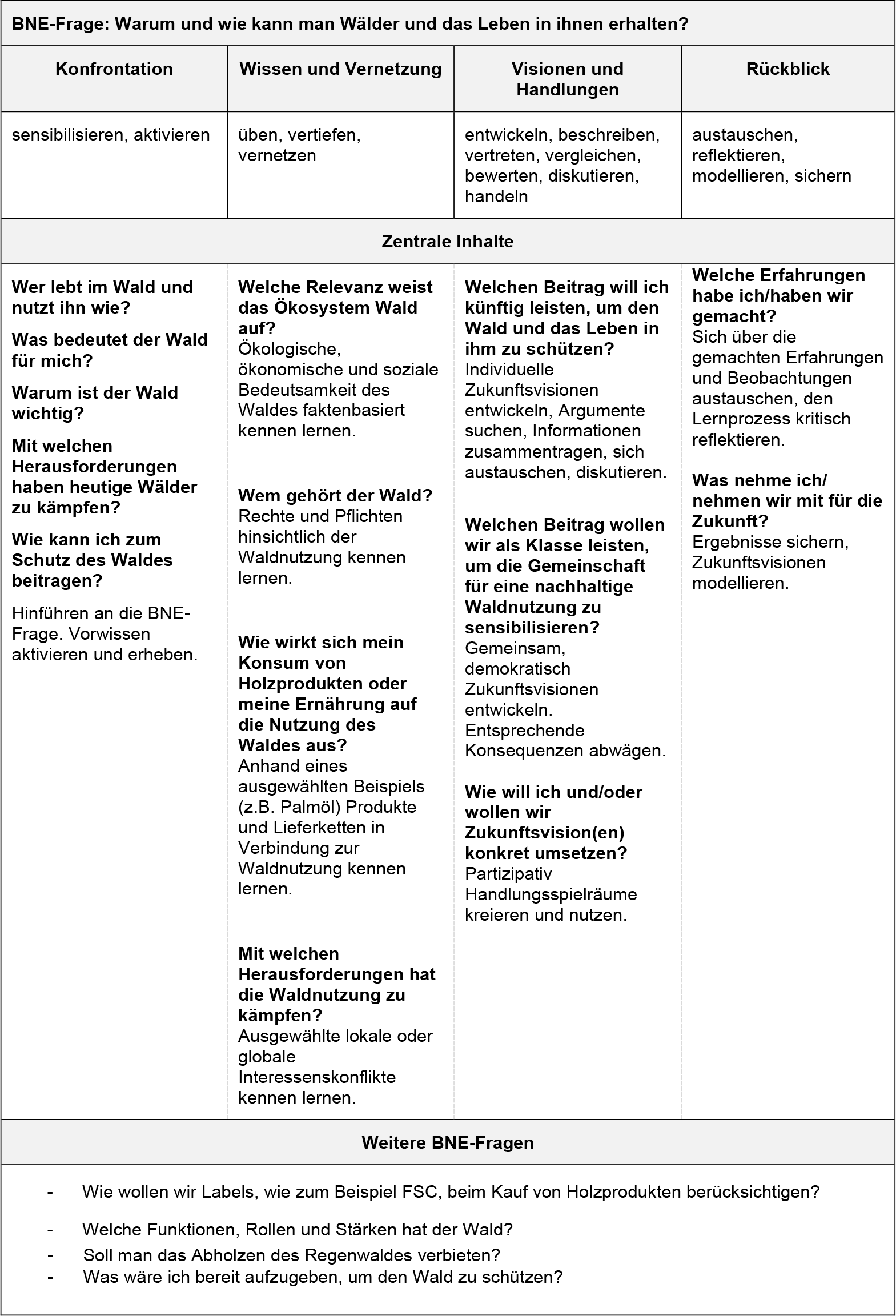 Um den Wald als Wirtschaftsraum zu verstehen, untersuchen die Schülerinnen und Schüler lokale und globale Folgen der Ressourcennutzung und diskutieren Ansätze für einen nachhaltigen Umgang (NT 3.3). Sie lernen Holz als natürliche Ressource und Energieträger kennen (RZG 1.4) und beschäftigen sich mit Produktionsprozessen ausgewählter Holzprodukte. Dabei beziehen sie ökonomische, soziale und ökologische Überlegungen mit ein (WAH 1.3).