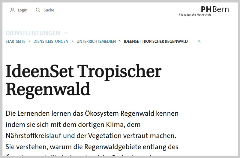 Mit dem interaktiven Online-Lernmedium erfahren die Schüler/innen Wissenswertes über die Tiere und Pflanzen des Regenwaldes, seine Bedeutung für das Klima und was unser Konsumverhalten damit zu tun hat.Draussen unterrichten