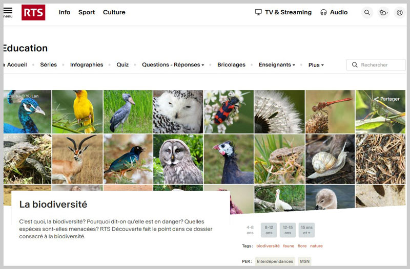 RTS Découverte vous propose de découvrir quelques aspects de la biodiversité, comme les poissons nettoyeurs, les amibes, les vers de terre ou encore les plantes invasives...Reportages, interviews TV et audio, fiches conseils.C’est quoi la biodiversité ? / cycle 1