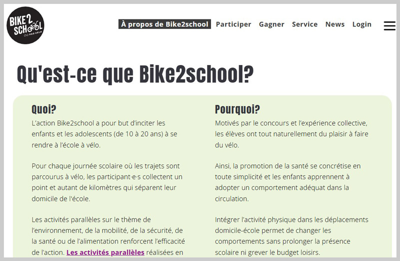 Bike2school motive les élèves de toute la Suisse à enfourcher leurs petites reines. A partir de 10 ans, les élèves se rendent à l'école à vélo aussi souvent que possible pendant la durée de l'action. Ils collectent ainsi des points et des kilomètres, avec à la clé des prix individuels et collectifs attrayants.Fit 4 future - (Cycles 1 et 2)