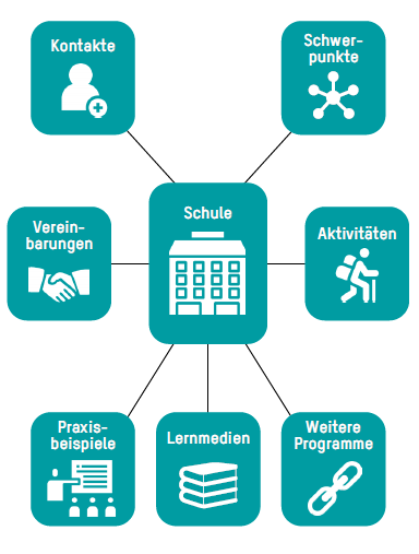 In den kommenden Monaten entsteht die schweizweit grösste Plattform, auf der ein riesiger Fundus an Praxisbeispielen zu gesundheitsfördernden und nachhaltigen Themen für die Schule und den Unterricht entdeckt und genutzt werden kann. Dank der strukturierten Ablage lassen sich Informationen zu den Schulen und ihren thematischen Schwerpunkten und Aktivitäten rund um Gesundheitsförderung und BNE rasch finden. Zudem gibt es Links zu Praxisbeispielen aus den Schulen, den genutzten Lernmedien und Praxisbeispielen.
