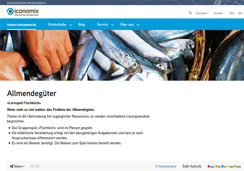 «Wenn viele zu viel wollen» – der Untertitel verrät, worum es beim Unterrichtsmaterial geht: Ausgehend vom Fischteich-Spiel wird die nicht nachhaltige Nutzung von frei zugänglichen Ressourcen, sogenannten Allmendegütern, unmittelbar erlebbar gemacht. Die Lernenden schlüpfen in die Rolle von Fischern, die in denselben Fischgründen fischen. Sie haben einerseits ein individuelles Interesse daran, möglichst viele Fische zu fangen, andererseits würde es aus Sicht der Nutzungsgemeinschaft Sinn machen, die Gewinnmaximierung zu Gunsten des Erhalts des Fischbestands zurückzustellen. Im Anschluss an das Spiel folgt eine Reflexions- und eine Transferphase, in der das Dilemma auf andere Beispiele übertragen und Lösungsansätze im Hinblick auf eine nachhaltige Nutzung besprochen werden. Das Material eignet sich für die Berufsbildung und den gymnasialen Unterricht, insbesondere für die Fächer Wirtschaft, Gesellschaft, Ökologie, Geografie, Geschichte. Für einen Unterricht im Sinn von BNE lohnt es sich, den Transfer zu vertiefen und Beispielen aus dem unmittelbaren Lebensalltag (Schule, Freizeit) sowie aktuellen Herausforderungen bei Umweltgütern (z.B. Klima, Wasser) mehr Raum zu geben. Neu gibt es zusätzlich ein Rollenspiel «Palamós» (Erweiterungspaket für höhere Anforderungsniveaus).