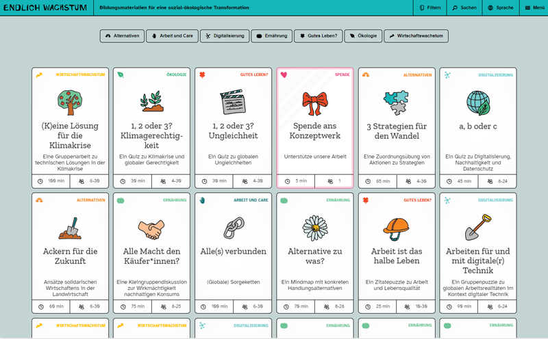 "Was wächst, wenn die Wirtschaft wächst?" Die Onlineplattform "Endlich Wachstum" bietet inhaltlich und methodisch unterschiedlichste Bildungsmaterialien für eine sozial-ökologische Transformation. Der Fokus besteht für die Lernenden entsprechend darin, die Wirtschaft neu und nachhaltig zu denken. Verschiedene Module zu unterschiedlichen Bereichen der Wirtschaft helfen hierbei: ökologische, soziale, globale Dimension, Digitalisierung, Arbeit, mentale Infrastrukturen, Lebensmittel, Perspektiven und Alternativen etc.