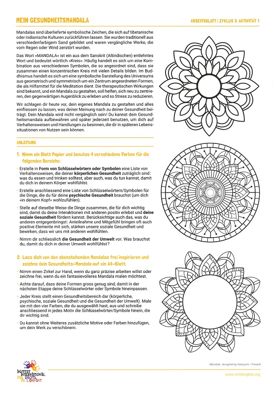 Zyklus 3: In einer ersten Anergung reflektieren die Schüler/-innen anhand eines Mandalas eigenen Verhaltensweisen in Bezug auf ihr Wohlbefinden. Mit "Kurzmeldungen aus aller Welt" setzten sich die Schüler/-innen in der zweiten Anregung mit der globalen Gesundheitssituation und der Bedeutung der Kinderrechtskonvention auseinander.