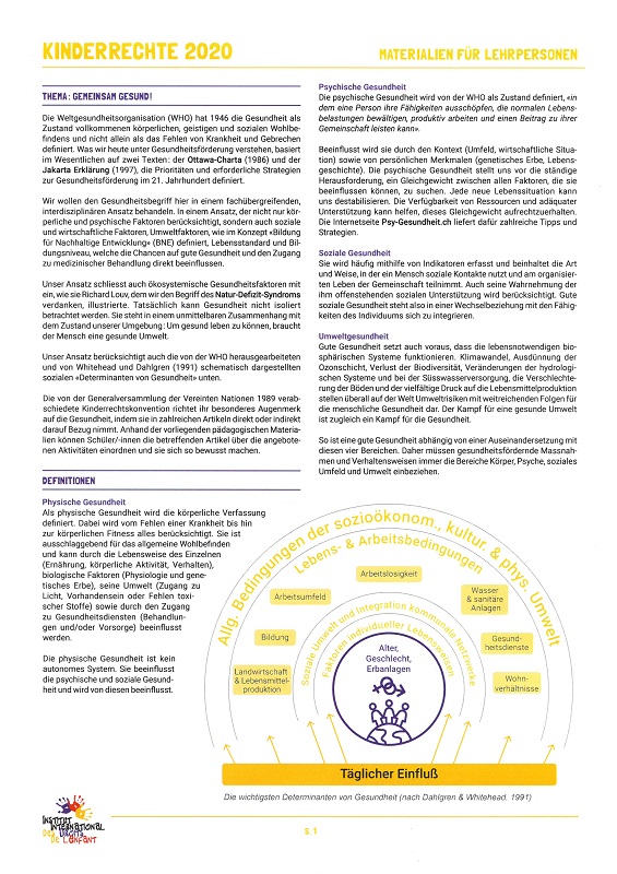 In den diesjährigen Unterrichtsimpulsen zum Kinderrechtstag wird der Gesundheitsbegriff in einem fachübergreifenden, interdisziplinären Ansatz behandelt. So werden nicht nur körperliche und psychische, sondern auch soziale, wirtschaftliche und ökologische Faktoren beleuchtet - ganz im Sinne einer Bildung für Nachhaltige Entwicklung. Mit den pädagogischen Materialien lernen die Schüler und Schülerinnen ihre eigenen gesundheitlichen Bedürfnisse, die Bedeutung zwischenmenschlicher Beziehungen und die entsprechenden Artikel der Kinderrechtskonvention kennen.
