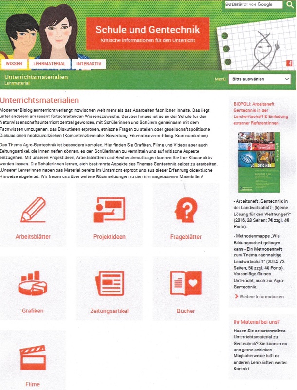 Die Webseite bietet zahlreiche Elemente, um einen spannenden, schülerzentrierten Unterricht für Zyklus 3 und die Berufsbildung zum Thema Gentechnik zu gestalten. In der Rubrik Wissen gibt es u.a. Grundlagetexte, Fallbeispiele, ein Glossar sowie Pro- und Contra-Ansichten zu wichtigen Fragen, die mit Gentechnik verbunden sind wie zum Beispiel: Brauchen wir Gentechnik, um den Hunger zu bekämpfen? In der Rubrik Lehrmaterial finden sich herunterladbare Arbeitsblätter und Zeitungsartikel, interessante Grafiken zum Einbau in selbst erstellte Präsentationen oder Plakate sowie Projektideen, welche die Lernenden aktiv werden lassen.