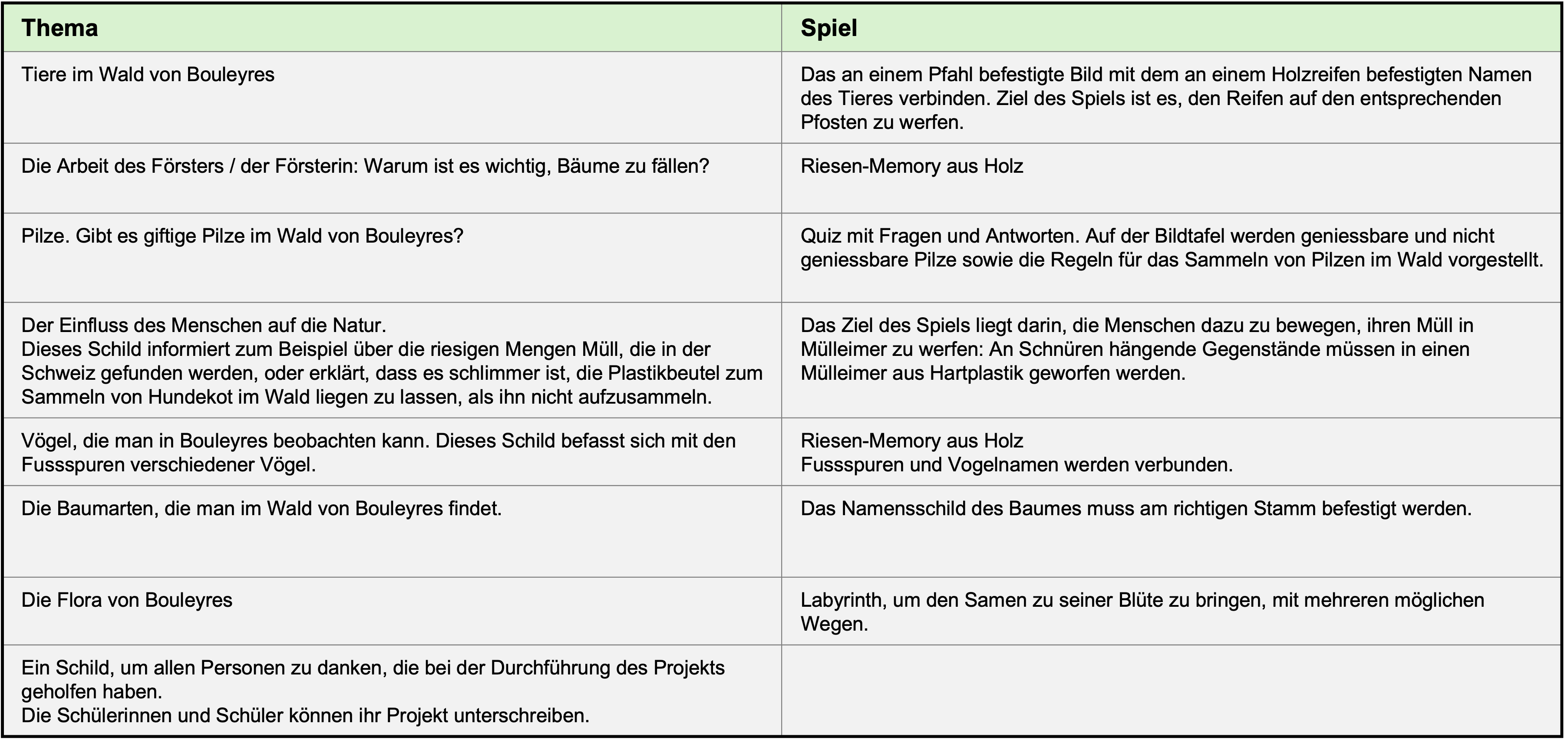 Die Schulklasse aus Bulle hat die Erfahrung gemacht, dass die Informationsschilder im Alltag oft übersehen werden. Deshalb sind kreative Ideen gefragt, um Waldbesuchende für den Lehrpfad zu gewinnen. Die Klasse entscheidet sich für Spiele. Aus vielen gesammelten Spielideen wird dabei eine Auswahl getroffen. Die Lehrperson unterstützt das Auswahlverfahren, indem sie darauf hinweist, welche Ideen tatsächlich realisierbar sind.Themen der Schilder und zugehörige Spiele