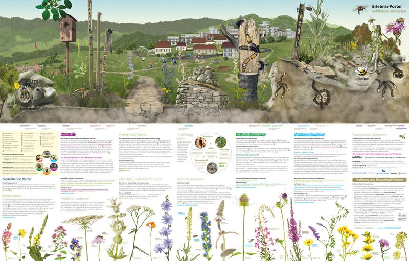 Auf dem Erlebnis-Poster finden sich Illustrationen, Anregungen und Tipps zum Einsatz sowie Einblicke in die Nistplätze und Brutzellen. Es ist ein hilfreicher Begleiter für die Entdeckungsreisen rund um die Wildbienen (gehört zum gleichnamigen Lehrmittel).