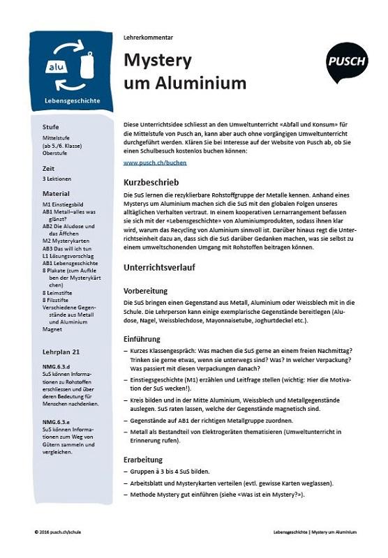 Anhand eines Mysterys um Aluminium befassen sich die Schüler/-innen mit der «Lebensgeschichte» von Aluminiumprodukten, erfahren, warum das Recycling von Aluminium sinnvoll ist und was sie dazu beitragen können.