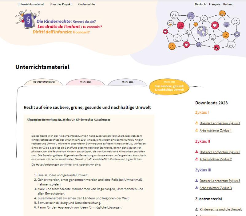 Das Unterrichtsmaterial zum Tag der Kinderrechte 2023 widmet sich dem Thema Umwelt. Das Recht auf eine saubere, grüne, gesunde und nachhaltige Umwelt ist in der Kinderrechtskonvention nicht ausdrücklich formuliert. Dies veranlasste den Kinderrechtsausschuss der UNO im Juni 2021, eine «Allgemeine Bemerkung» zu Kinderrechten und Umwelt, mit einem besonderen Schwerpunkt auf dem Klimawandel, zu verfassen.