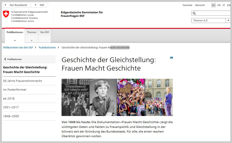 Von 1848 bis heute: Die Dokumentation «Frauen Macht Geschichte» zeigt die wichtigsten Daten und Fakten zur Frauenpolitik und Gleichstellung in der Schweiz. Für alle, die einen raschen Überblick gewinnen wollen (auch als Poster erhältlich). Ergänzend Fachzeitschrift «Frauenfragen» mit ausgewählten Themen.Schweizerische Konferenz der Gleichstellungsbeauftragten SKG