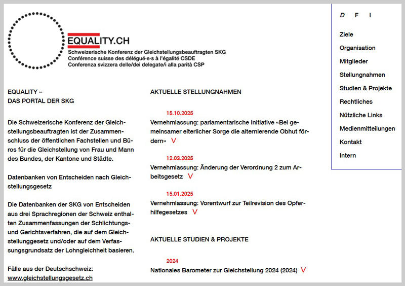 Die SKG ist der Zusammenschluss der öffentlichen Fachstellen und Büros für die Gleichstellung von Frau und Mann des Bundes, der Kantone und Städte mit dem Ziel, eine langfristige und kohärente Gleichstellungspolitik in der Schweiz zu verfolgen.«Geschlecht. Jetzt entdecken» (Ausstellung, ab Zyklus 2, Stapferhaus Lenzburg)