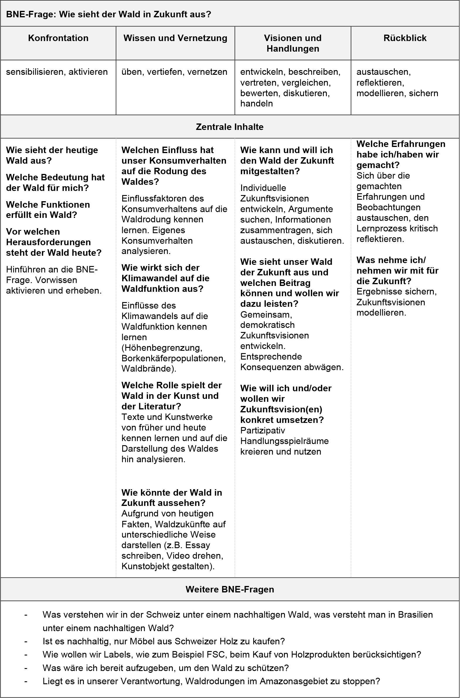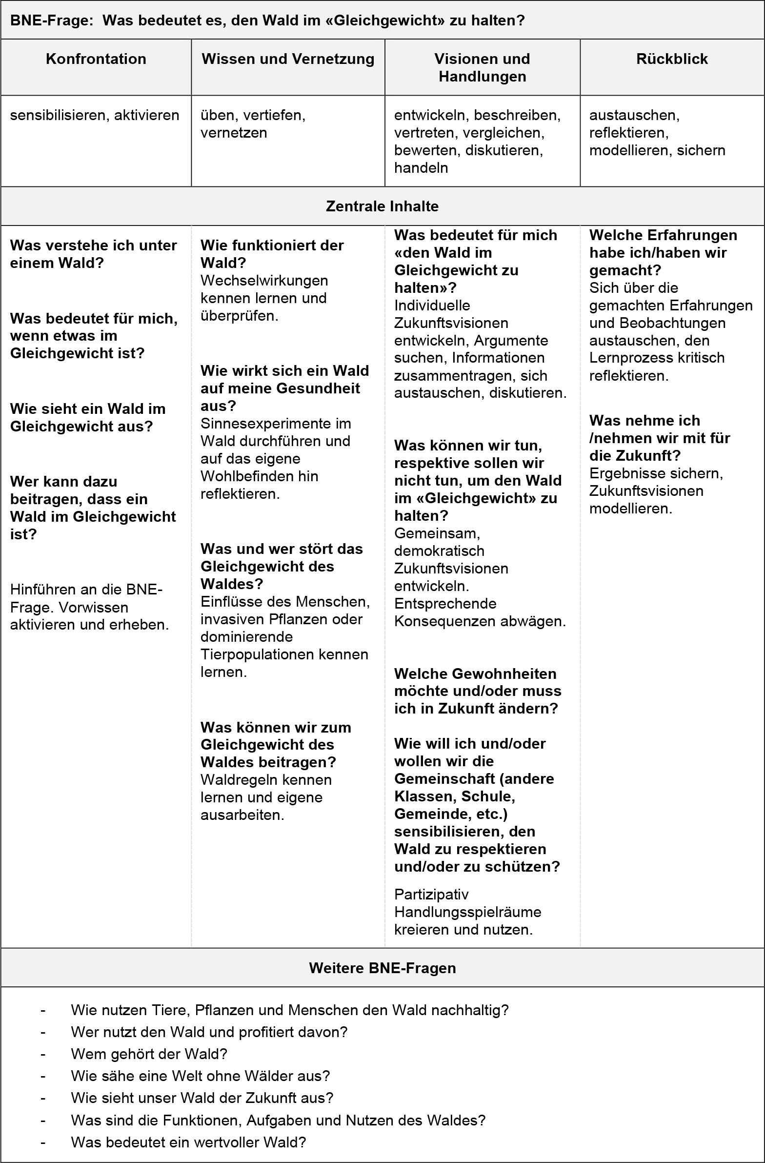 BNE-Fragen geben Lehrpersonen eine inhaltliche Orientierungshilfe, um den Fokus im komplexen, gesellschaftsrelevanten Thema zu behalten und ermöglichen es den Schülerinnen und Schülern, sich mit Fragen der Nachhaltigen Entwicklung im Kontext «Wald» auseinander zu setzen.