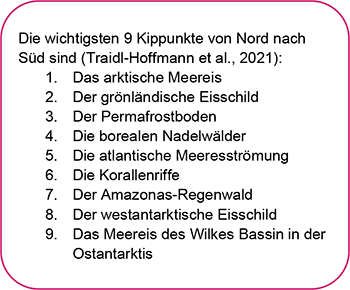Auffallend ist, dass die Erderwärmung nicht gleichmässig über alle Regionen der Erde verteilt stattfindet. In der Arktis erfolgt sie doppelt so schnell wie im globalen Mittel. Europa ist derjenige Kontinent, der sich am schnellsten erwärmt. Eine besondere Gefahr des anthropogenen Klimawandels besteht darin, dass das Überschreiten bestimmter Temperaturschwellen in gewissen Gebieten unumkehrbare Prozesse in Gang setzt, (Kippunkte oder point of no return). So führt beispielsweise das Abschmelzen von Eisflächen zu einer geringeren Reflexion der Sonnenstrahlen, was wiederum zu weiteren Temperaturanstiegen führt. Parallel dazu steigt der Meeresspiegel an, was zu Überschwemmungen von küstennahen Städten und somit zu Flucht und Migration führen kann. Mit der globalen Erwärmung gehen auch extreme Wetterereignisse wie Brände, Überflutungen, Dürren, Hitzewellen und Stürme einher (siehe auch: