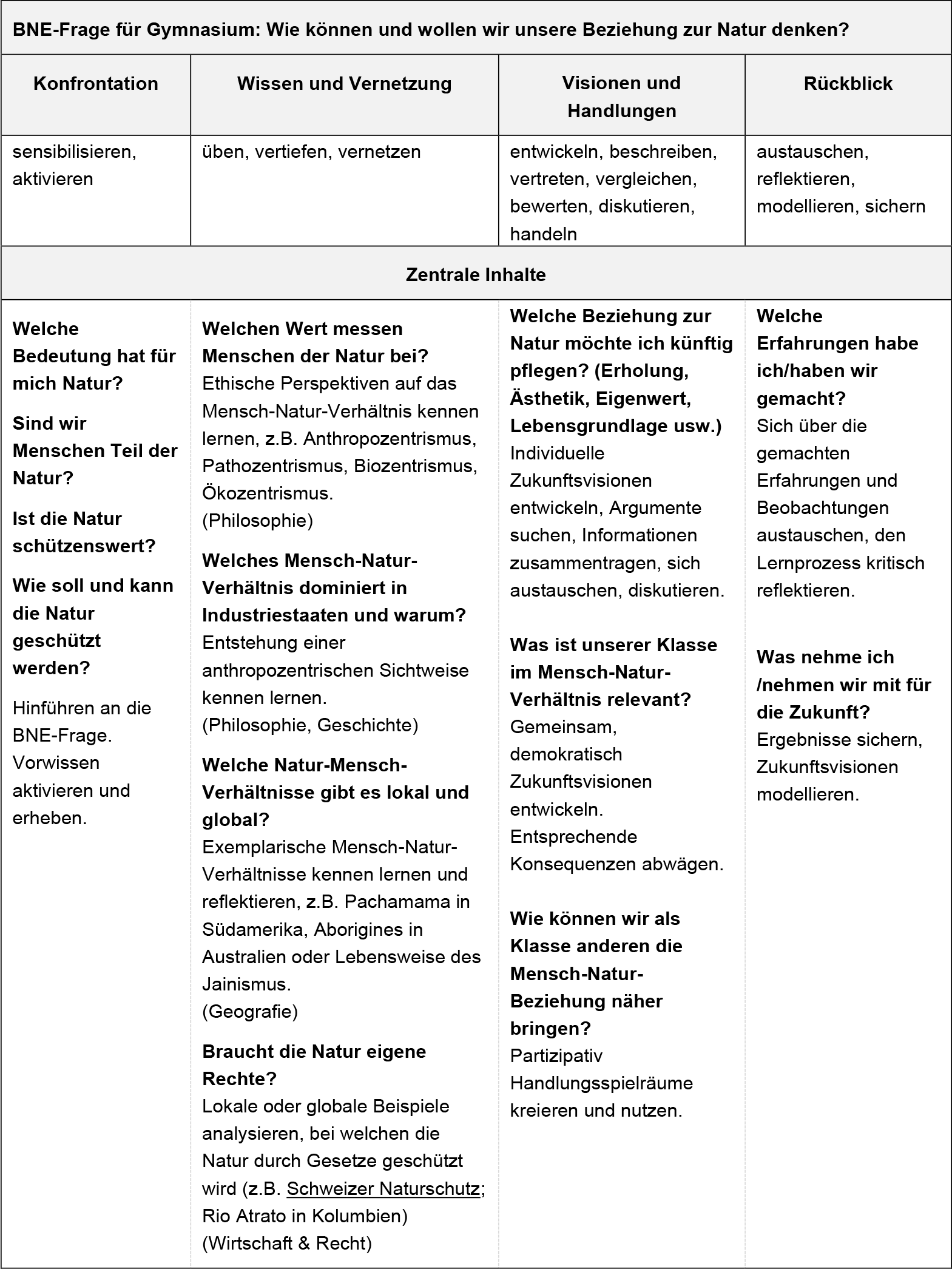 Da Zusammenleben im Sinne einer nachhaltigen Entwicklung auch der Einbezug der Umwelt erfordert, setzen sich die Schüler/innen und Lernenden mit ihrem eigenen Verhältnis zur Natur auseinander. Dieses vergleichen sie mit gesellschaftlichen Natur-Mensch-Verhältnissen und diskutieren, welchen Wert der Natur beigemessen werden sollte.Umsetzung von BNE-Fragen im Unterricht