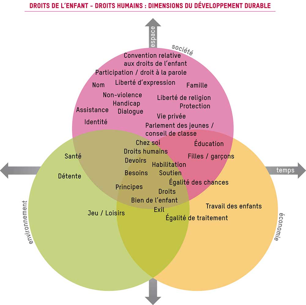 Découvrir, interroger la mise en œuvre et expérimenter ses droits humains et de l’enfant contribue à exercer de nombreuses compétences EDD : développer la connaissance, l’estime et la confiance en soi ; gérer les contradictions entre divers droits, entre besoin de protection et désir de liberté ; élaborer avec autrui des mesures pour préserver et contribuer à façonner son environnement proche ; débattre en prenant en compte les enjeux et les limites inhérentes à une problématique ; comprendre la valeur de la participation et la signification de la démocratie dans le cadre de la durabilité ; développer des compétences interpersonnelles comme la communication, la collaboration, le respect et l’empathie. Autrement dit : prendre soin de soi, des autres et de son environnement naturel.L’Agenda 2030 de l’UNESCO, à travers ses 17 objectifs de développement durable, incarne l’espoir d’une bonne qualité de vie pour chacune et chacun, dans le respect de ses droits. Ces objectifs couvrent des domaines variés, y compris la santé et le bien-être, l’éducation, la paix, la justice, un travail décent, des inégalités réduites, la lutte contre les changements climatiques, etc. Dans leur objectif 4 (accès à une éducation de qualité), ils soulignent l’importance de promouvoir les droits humains et de l’enfant à travers l’éducation.