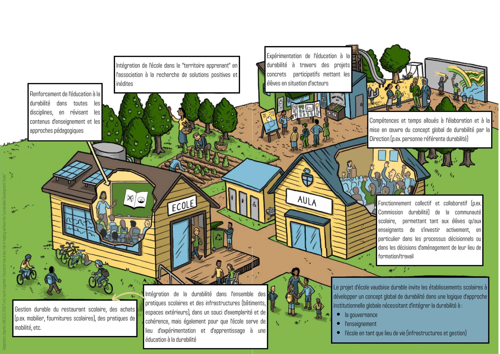 Il s’agit d’un outil pratique proposé par La Cellule durabilité du Département de l’enseignement et de la formation professionnelle du canton de Vaud afin de réaliser la mise en œuvre de la durabilité au niveau d’établissements, inspiré par WSA (Whole School Approach).Approche institutionnelle globale (Ecole vaudoise durable)