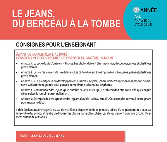 Ce jeu, conçu pour des groupes de 6 à 24 participants, permet d'aborder la thématique de la consommation et de ses processus industriels. La représentation du cycle de vie d'un produit au travers d'une succession de plus de 50 cartes est très parlante : elle facilite la prise de conscience du nombre élevé d'étapes et d'acteurs qui se cachent derrière un objet de notre quotidien.Exemples de pratiques