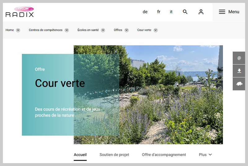 Radix soutient des écoles désireuses d’aménager des espaces naturels au sein de places de jeux ou de cours de récréation qui promeuvent le mouvement et qui sont utilisables à des fins pédagogiquesGuide école - (Cycles 1 à 3)