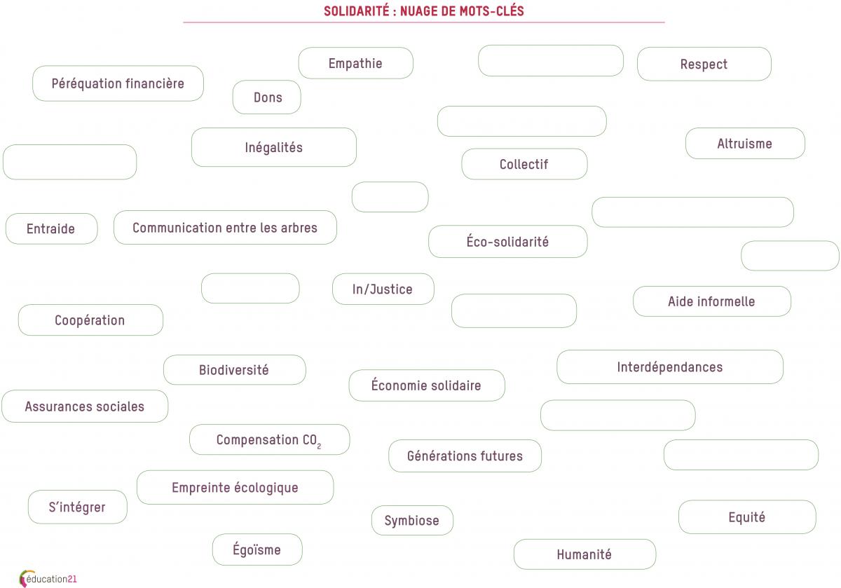 Que ce soit à l’échelon familial, social, humanitaire, international, intergénérationnel, écologique, économique ou syndical, la solidarité se fonde sur une étroite interdépendance des individus. Cela recèle des chances mais aussi des défis : les gens s’unissent pour se soutenir mutuellement et agir ensemble. La solidarité et la coopération sont des stratégies importantes, particulièrement dans des situations de crise. Sous l’angle d’une EDD, la solidarité signifie également que l’on porte ensemble la responsabilité de la préservation de la biosphère et de la justice climatique. En outre, elle inclut aussi la volonté de concevoir la production, la consommation, le travail et la prospérité de manière à ce que le respect pour les humains et l’environnement occupe le premier plan.