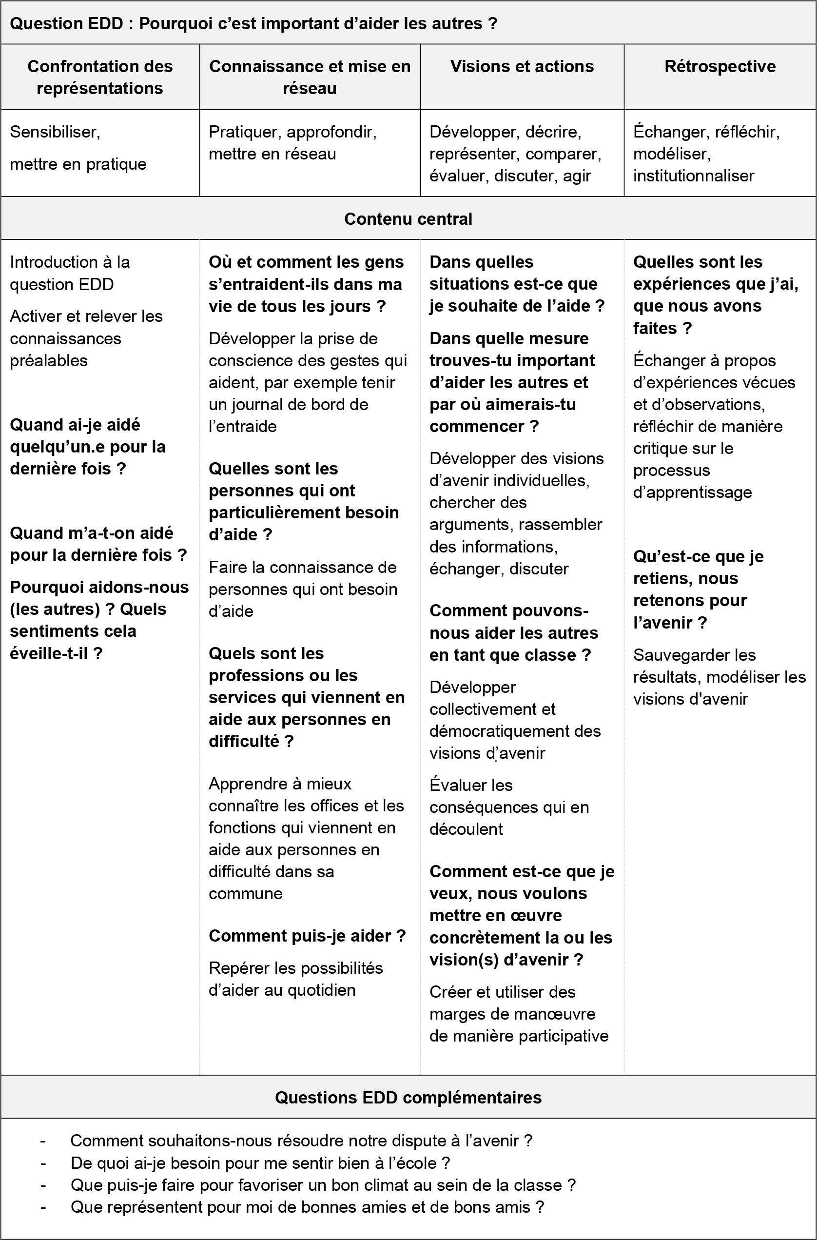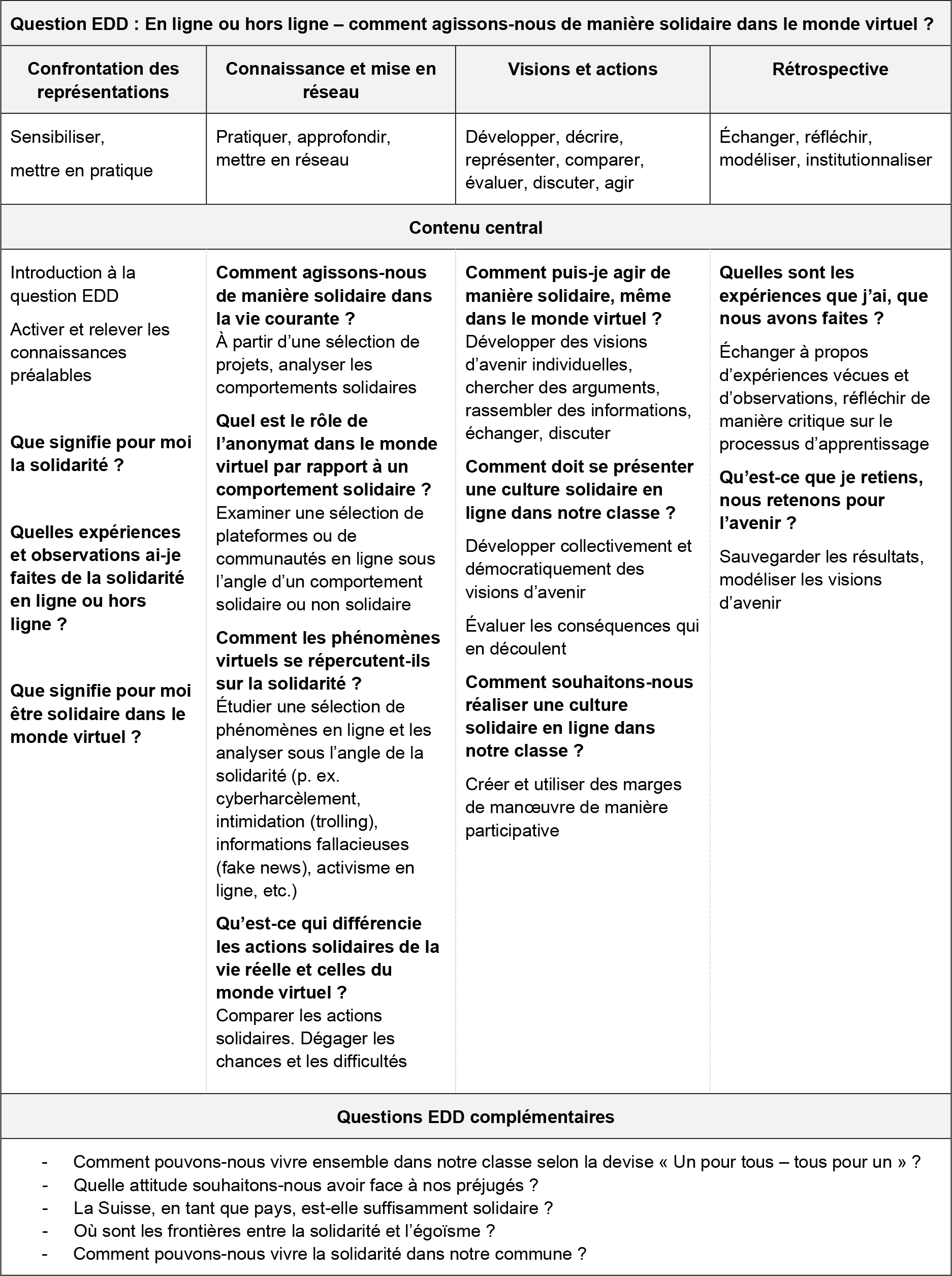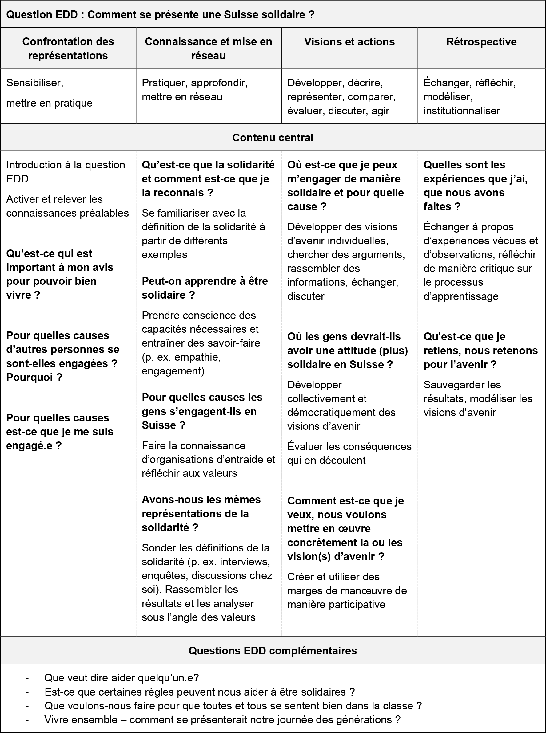 Les questions EDD offrent aux enseignantes et enseignants des points de repère quant au contenu afin de s’orienter dans cette thématique complexe et pertinente pour la société ; elles permettent aussi aux élèves de réfléchir à des questions liées au développement durable dans le contexte de la « solidarité ».