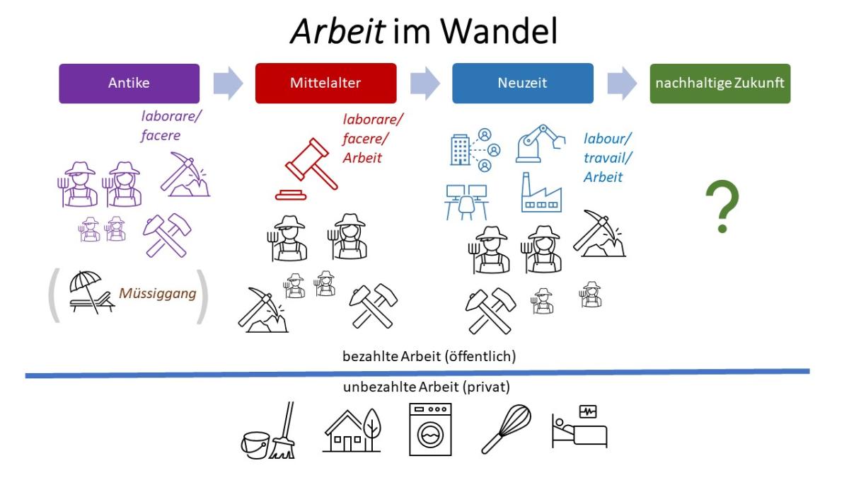 Le monde du travail n’a jamais cessé de se transformer. Aujourd’hui, ces changements résultent de différents facteurs : le changement climatique, la numérisation, la transformation des valeurs et des normes sociétales, les innovations technologiques et les pandémies. Ces différents éléments ainsi que d’autres urgences écologiques et sociales ont conduit à l’idée générale de la durabilité et à des programmes d’application concrets du Développement Durable. En même temps, le monde du travail influence lui aussi ces urgences. Les processus de travail utilisent des ressources et de l’énergie ; ils génèrent des déchets et des émissions. Le monde du travail peut pour sa part amener des innovations en faveur d’une économie plus durable. Il y a donc des rapports de réciprocité complexes.