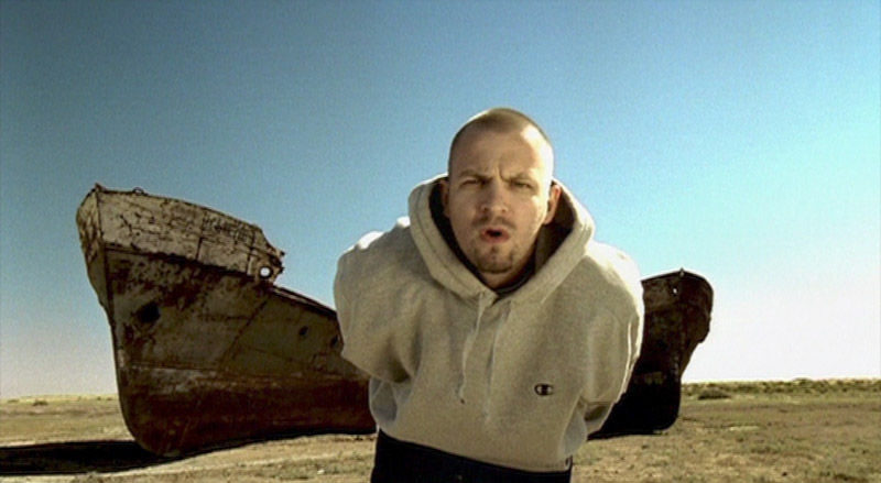 Le rappeur Stress chante devant le décor de bateaux échoués de la mer d'Aral ancienne. Il chante contre da déstruction de l'environnement et lance un appel de responsabilité: