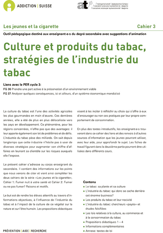 Outil pédagogique constitué de trois cahiers proposant chacun des suggestions d'animation en classe. Le premier traite de la dépendance au tabac et des comportements à risque chez les jeunes, le deuxième de ce qui influence le comportement des jeunes face à la cigarette et le troisième de l'industrie du tabac (production et marketing). Pour permettre une vision globale de la thématique, les trois cahiers ne doivent pas être considérés séparément. Ainsi, les élèves approchent le thème du tabac du point de vue de leur santé, comme du point de vue des conséquences écologiques et économiques dans les régions concernées par la culture du tabac. Ils sont amenés à réfléchir à leur comportement, notamment concernant les situations à risque, à ce qui influence leurs choix de consommation, ainsi qu'aux conséquences de ces choix sur eux-mêmes, les autres (ici et ailleurs) ou l'environnement. Les propositions didactiques sont assez variées: travail de groupe et individuel, fiches de travail, jeu de rôle, exposés, etc. Une ressource assez « classique », mais efficace.