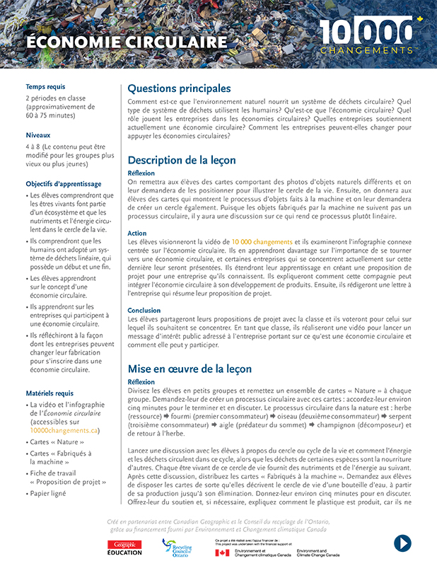 En conclusion, les élèves partagent leurs propositions de projet avec la classe et votent pour celui sur lequel ils souhaitent se concentrer. En tant que classe, ils peuvent prévoir une réalisation pour lancer un message d’intérêt public adressé à l’entreprise portant sur ce qu’est une économie circulaire et comment elle peut y participer.