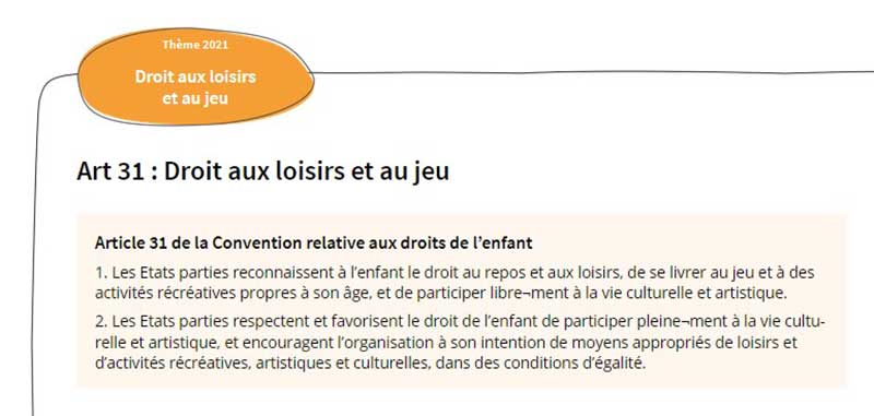 Les droits de l’enfant : tu connais ? En 2021, les Fiches Droits de l’enfant interpellent sur le droit au jeu, au temps libre et aux loisirs, un droit peu exploré et pourtant essentiel à la santé et au bon développement des enfants. Au travers d’activités ludiques, les élèves sont sensibilisés à leurs droits et au développement durable. La créativité, la conscience démocratique, la réflexion sur ses comportements et le partage d’opinions sont encouragés. Les activités proposées visent des compétences spécifiques de l’EDD, telles que penser en systèmes, penser de manière critique et constructive, réfléchir sur ses propres valeurs et celles d’autrui, la coopération ainsi que la participation. Les propositions récoltées dans les différentes animations pour favoriser le droit au jeu et aux loisirs, à l'école et à la maison, peuvent être concrétisées pour un impact à long terme.