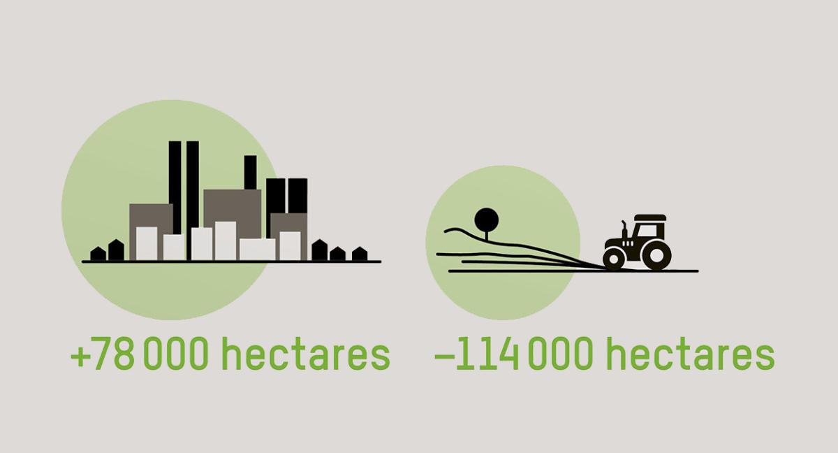 N'hésitez pas à lancer le débat en classe et à consulter les documents suivants : - Quel est le rapport entre ces deux chiffres « +78'000 et -114'00 hectares »et le sol ?