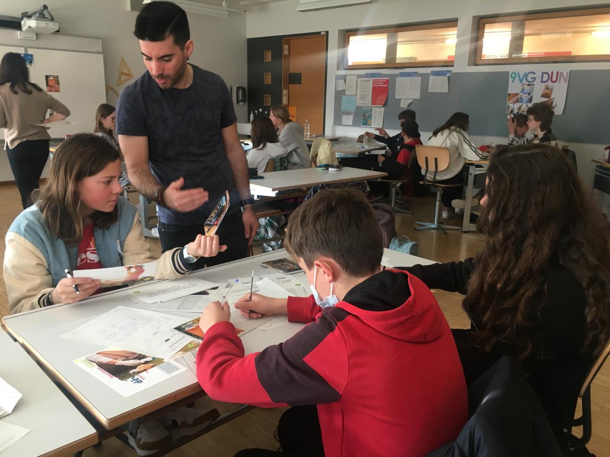 Après avoir pris conscience de leur consommation de bouteilles en PET, les adolescent.e.s retracent le cycle de vie de ces récipients avec Yvan Gonzalez, intervenant en milieu scolaire employé par la Coopérative romande de sensibilisation à la gestion des déchets (COSEDEC). Curieux et motivés, les élèves se regroupent autour d’un panneau qui contient plusieurs images: un forage pétrolier, une usine de raffinage, une fabrique de bouteilles et des points de collecte.