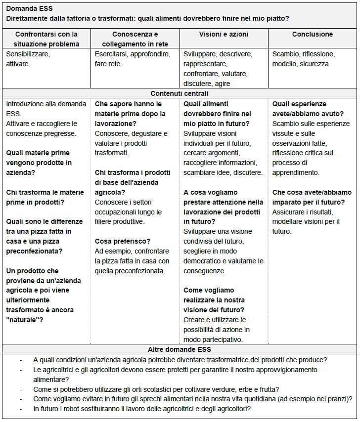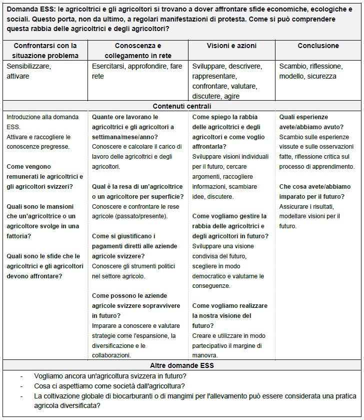La domanda ESS fornisce al corpo docenti delle indicazioni sui possibili contenuti per mantenere al centro dell'attenzione la complessità dell'argomento e la sua rilevanza sociale, consentendo alle allieve e agli allievi di affrontare le questioni dello sviluppo sostenibile nel contesto dell’agricoltura.