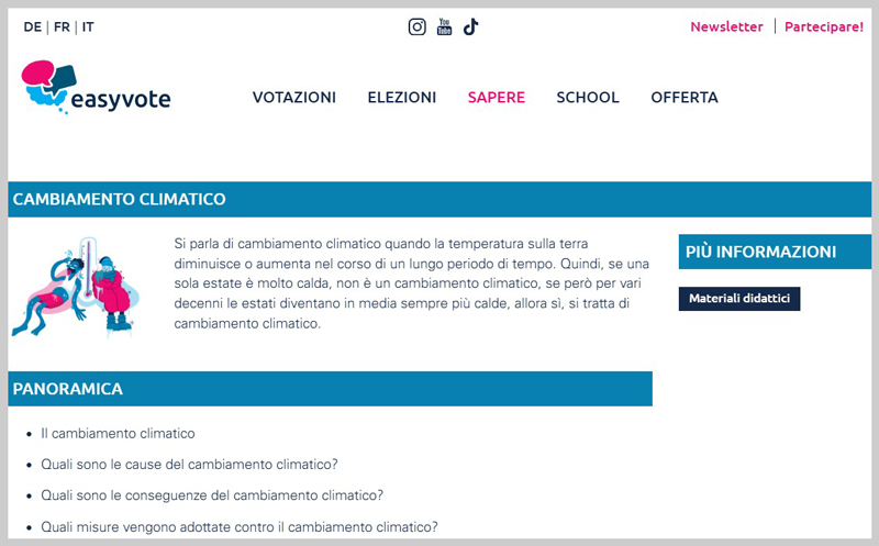 Raccolta di materiale didattico elaborato nel progetto CCESO (2019), adattato ai livelli scolastici menzionati e scientificamente fondato, con proposte di applicazione nei seguenti ambiti: sistema climatico, cause del cambiamento climatico, conseguenze del cambiamento climatico e misure di politica climatica per l’adattamento e la riduzione.Materiali didattici