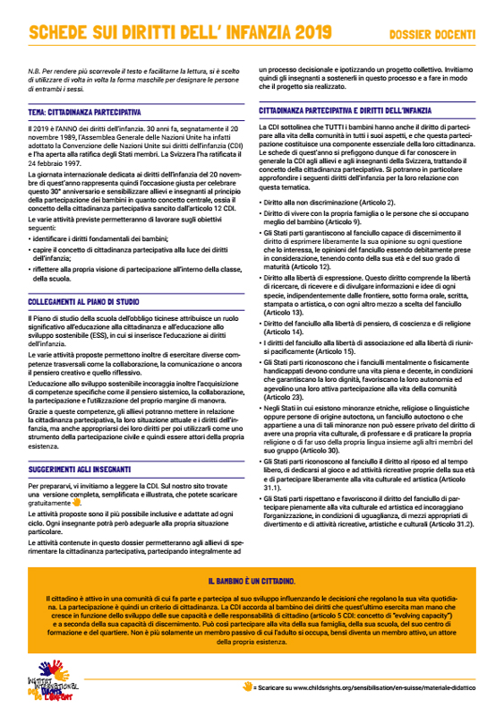 Le bambine e i bambini, così come le e gli adolescenti sono cittadini. I cittadini sono membri attivi di una comunità a cui appartengono e partecipano al suo sviluppo influenzandone le decisioni che regolano la loro vita quotidiana. È quindi importante che tutti conoscano i propri diritti per poterli esercitare.