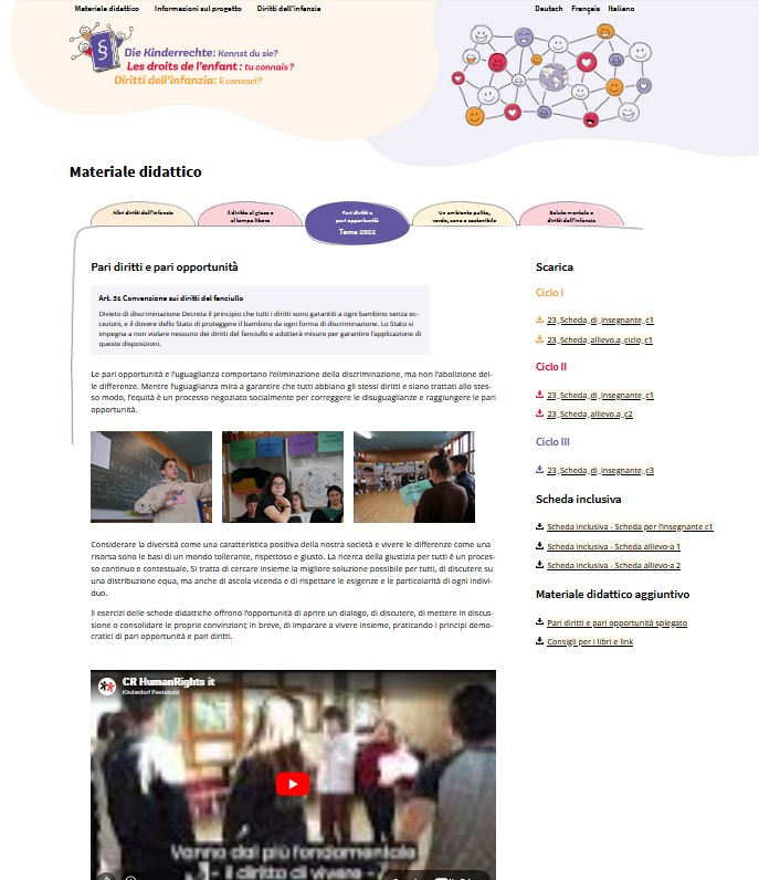 Il diritto alle pari opportunità e all’uguaglianza è il tema di queste schede didattiche che offrono agli insegnanti l'opportunità di esplorare i diritti dei bambini con le loro classi. Gli allievi vengono introdotti agli argomenti attraverso attività ludiche e poi imparano a conoscere i principi democratici di pari opportunità e uguaglianza attraverso metodi partecipativi.Diritti dell'infanzia 2021: diritto al gioco e al tempo libero