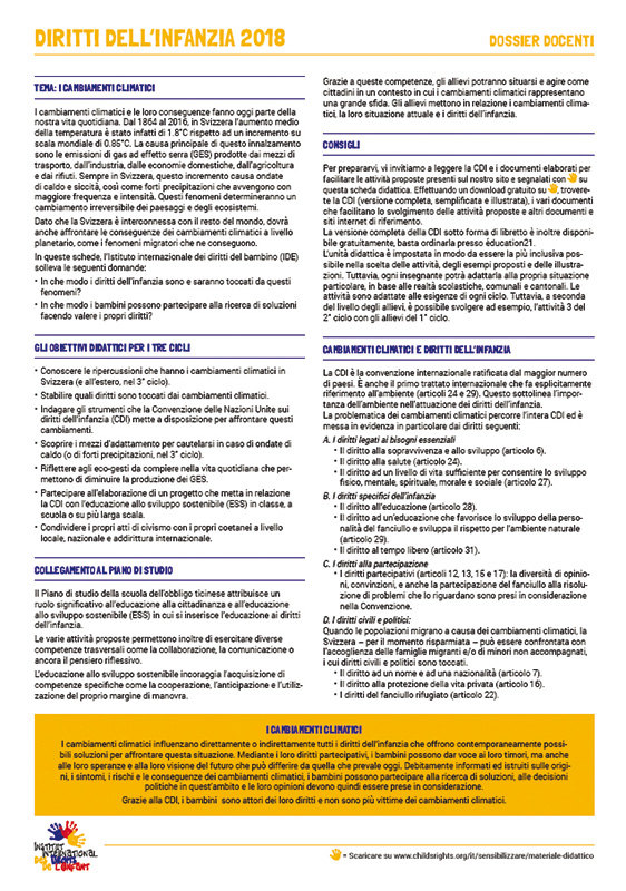 Le attività proposte permettono di individuare i diritti fondamentali delle bambine e dei bambini, comprendere la nozione di cittadinanza partecipativa e riflettere sulla propria visione della partecipazione in classe e a scuola. Le allieve e gli allievi prendono parte ad un processo decisionale e prendono in considerazione un progetto collettivo.Diritti dell'infanzia 2018: i cambiamenti climatici e i diritti del bambino